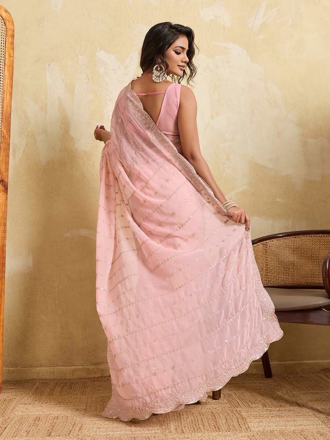 Georgette fabric is loved for its smooth texture and flowing drape, allowing the saree to fall beautifully and enhance the overall silhouette. This makes it ideal for women who want a combination of comfort and elegance.