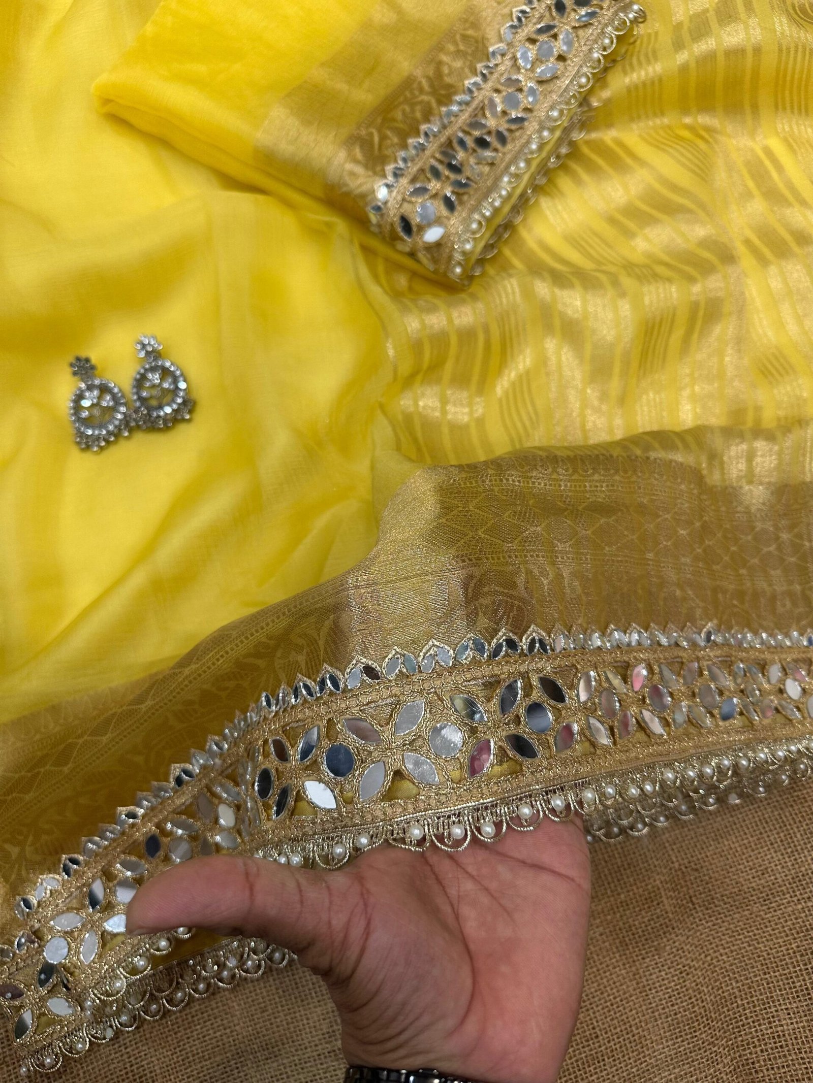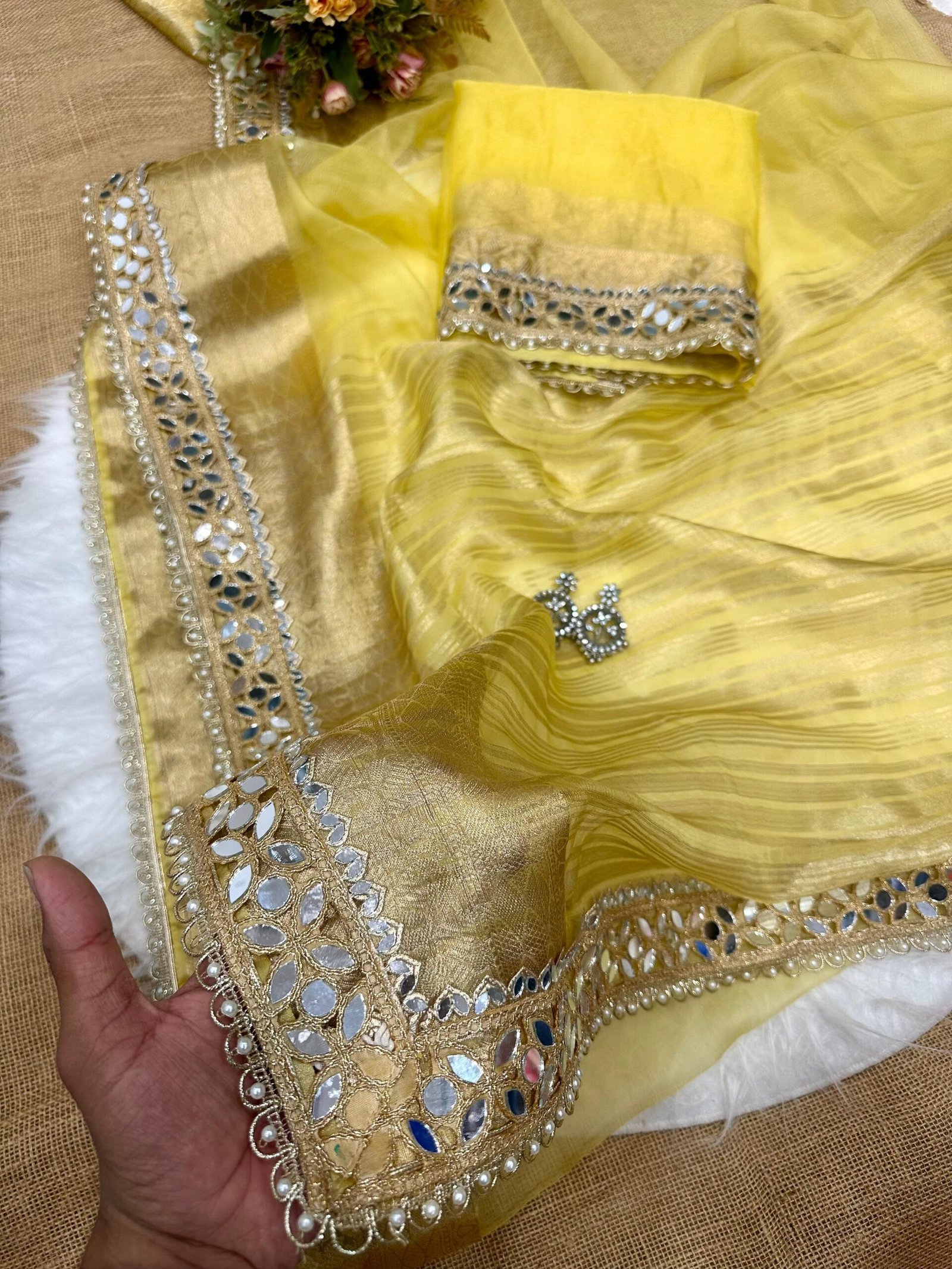 Designer Mirror Work Lace Border Soft Tissue Organza Saree with Rich Weaving Pallu & Blouse