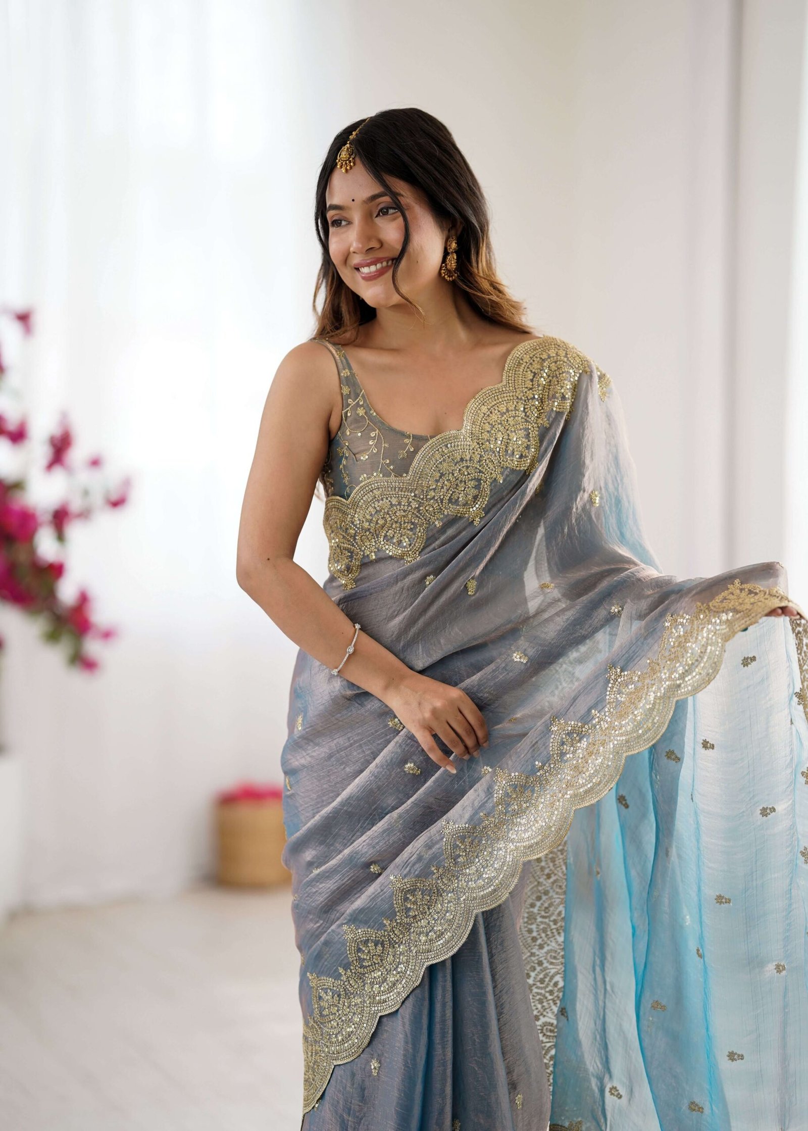 Designer Two Tone Fendy Chiffon Party Wear Saree with Embroidered Border and Satin Silk Blouse