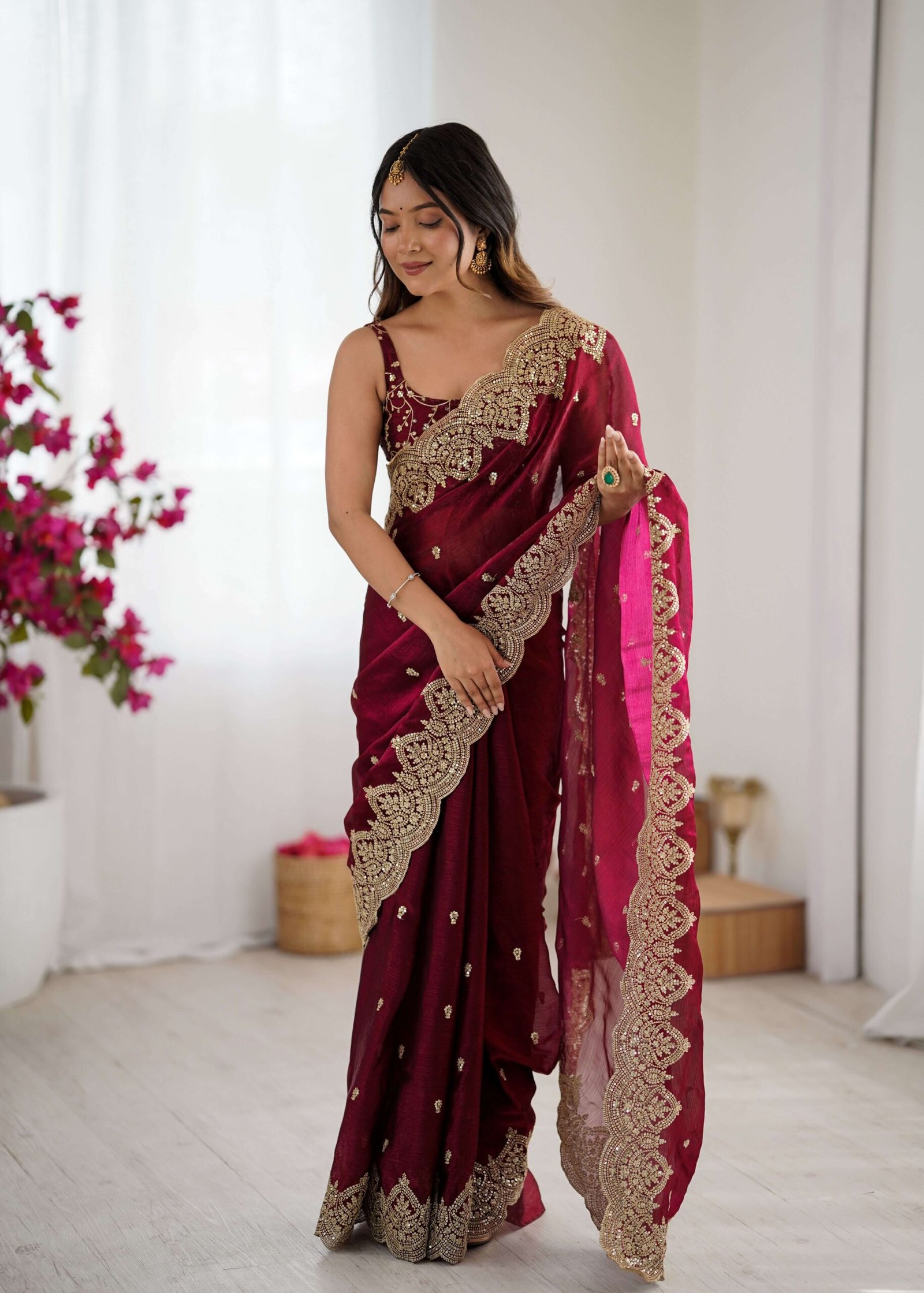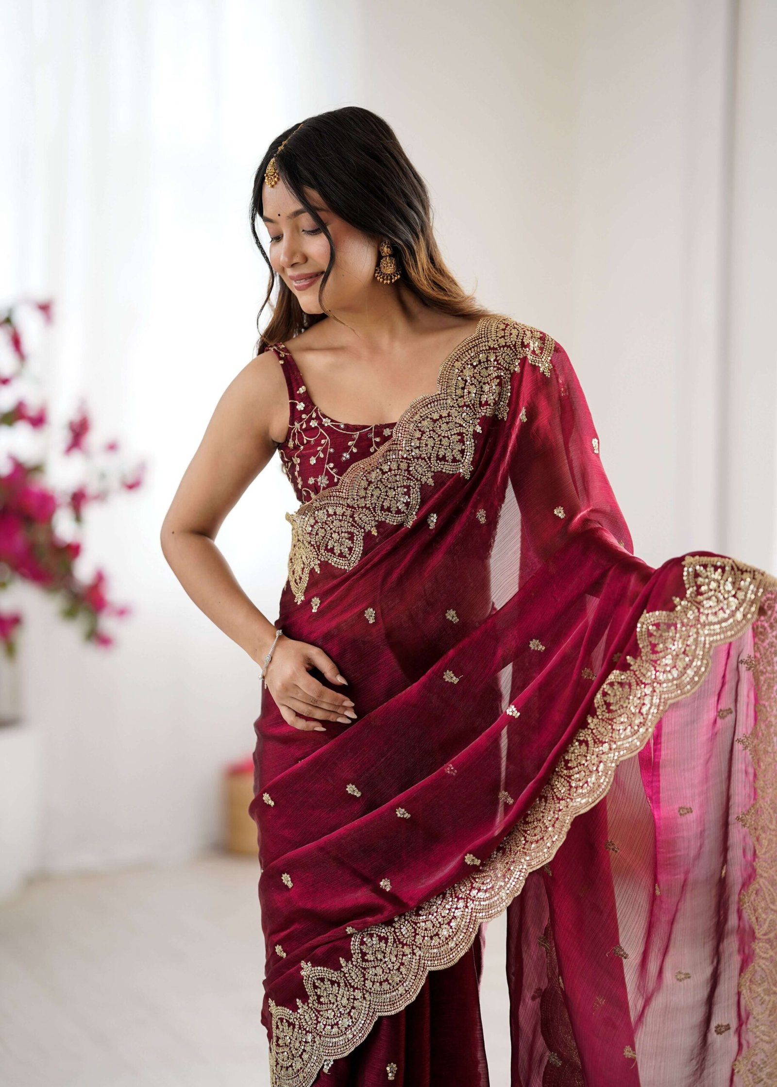 Adorned with delicate sequin and zari embroidery work, the saree features intricate craftsmanship that enhances its richness without overpowering its elegance. The beautifully coordinated satin silk blouse piece adds a smooth, polished contrast, completing the look effortlessly.